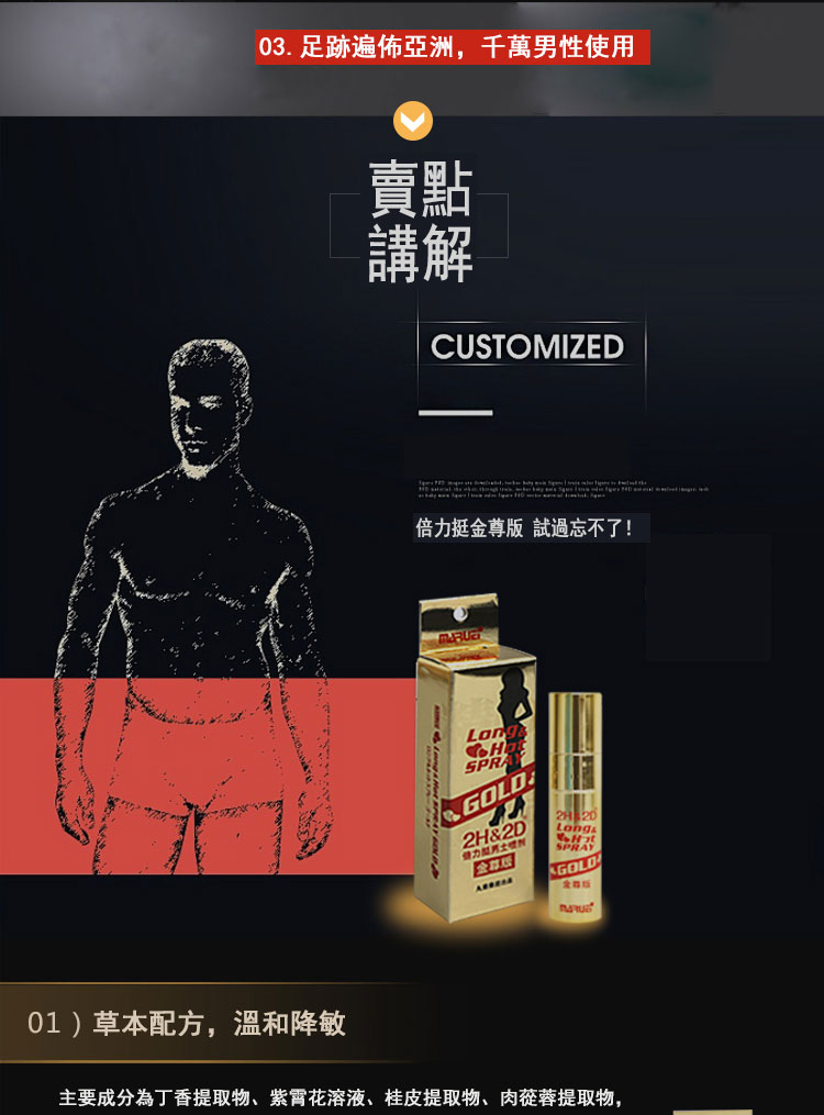 2H2D金尊版是專為男性設計的持久延時噴劑,採用升級配方,藥效更強,起效更快。這款噴劑以純植物草本精華製成,不含酒精或刺激性化學成分,安全無副作用,使用後無麻木感,延時效果可持續30至60分鐘,讓您與伴侶共享更美好的時光。