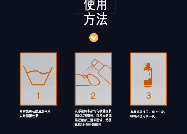 使用方法:在使用前先將私處清潔乾净,然後將本品均勻噴塗於冠狀溝部位,輕輕按摩至吸收,靜置15-20分鐘。對於早洩問題嚴重的男性,建議噴塗兩次以達到最佳效果。