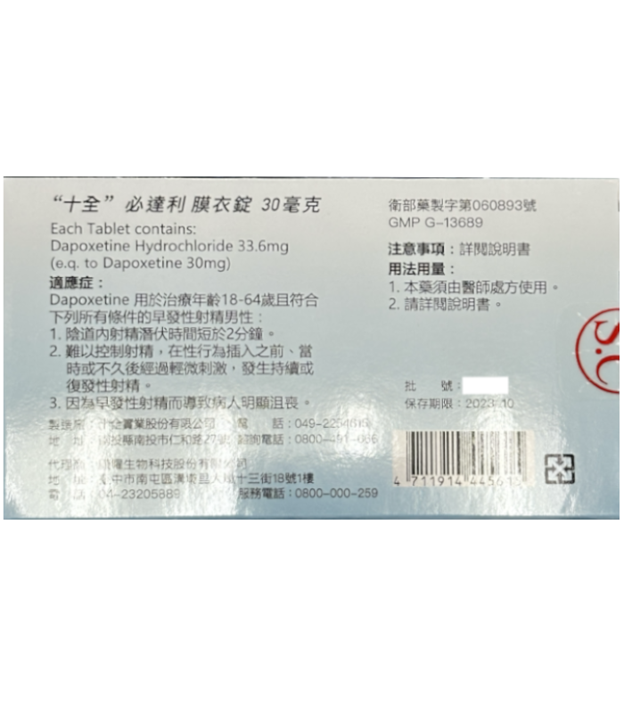 必達利膜衣錠30mg|早洩專用處方學名藥|十全實業製造
