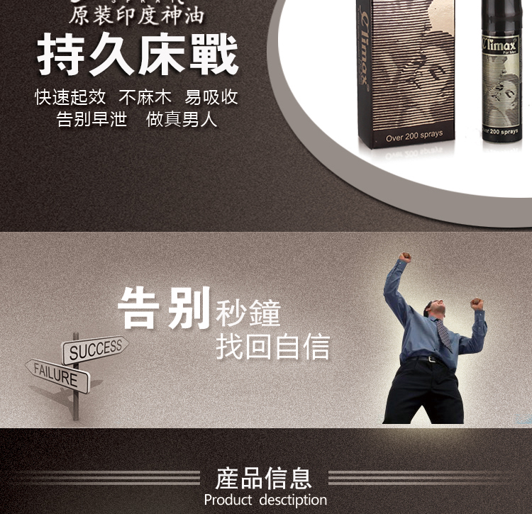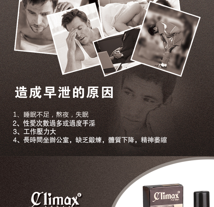 Climax延時噴劑,自創立以來,不斷完善配方,成為提升房事質量的最佳選擇,幫助無數男性提升自信,延長性愛時間,帶來更愉悅的性生活!
