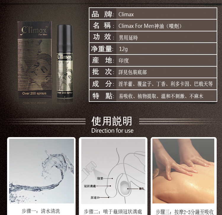 Climax持久噴劑專為東方男性設計,延時效果顯著,讓您在享受性愛的同時,提升持久力與威猛,徹底滿足您的伴侶需求!