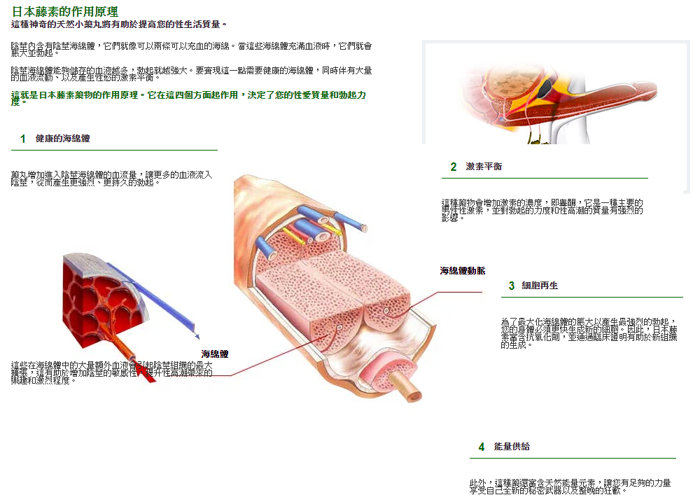 日本藤素成分既能補血又能活血,從而使該方達到益氣養陰活血通絡的功效,日本藤素另外一種有著獨特的轉離子生物因子改善海綿體組織微血循環,增加陰莖海綿體血流量,使陰莖充血、膨脹、壯大、堅硬。
