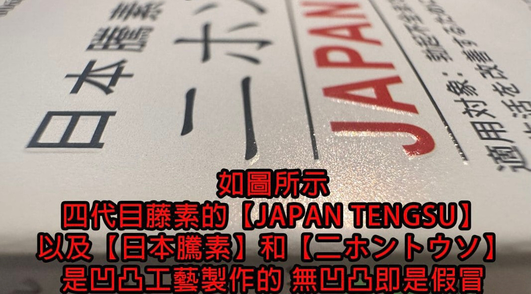 這次的包裝升級帶來了最新的四代目防偽技術,主要體現在包裝的凹凸防偽上。外包裝JAPAN TENGSU字樣的凹凸質感是正版四代目藤素的重要標誌。