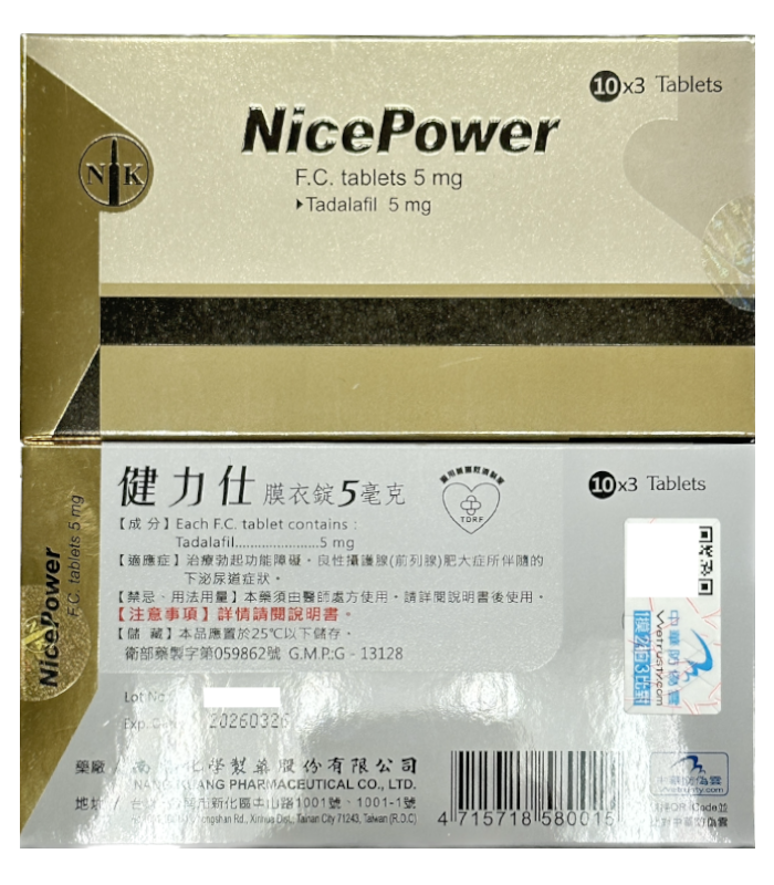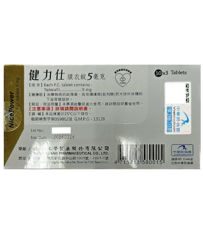 健力仕膜衣錠5mg(Okpower F.C. Tablets 5mg)為每日型男性保健用藥,主要成分為他達拉非(Tadalafil),為臨床常見之PDE5抑制劑,可有效改善勃起功能障礙(ED),並用於保養良性攝護腺肥大(BPH)引起之排尿困擾。