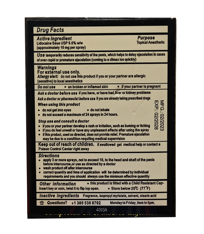 | 使用方式 | 性行為前20~30分鐘,噴塗於龜頭及冠狀溝部位,2~4下為宜,避免噴到尿道口,並輕輕按摩至吸收 |
