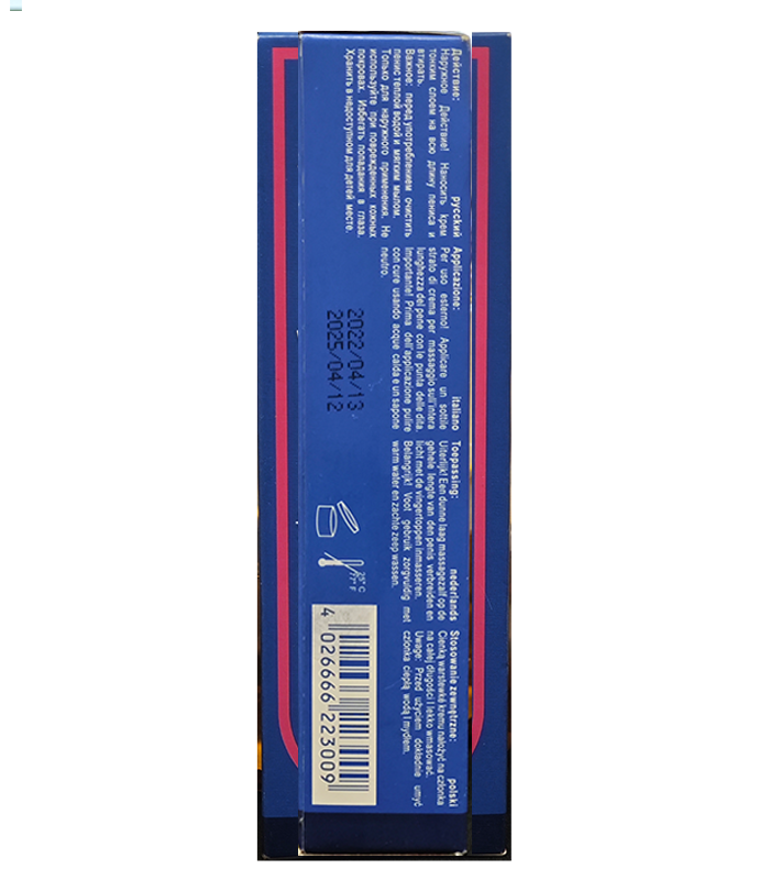 石蠟液、鯨蠟醇、香料、辣椒油、菸鹼酸異丙酯、檸檬烯、羥基香茅醛、檸檬醛、芳樟醇、α-異甲基紫羅蘭酮、丁基苯基甲基丙酸、香茅醇、水楊酸芐酯、香豆素、異丁子香酚、苯甲酸芐酯、香葉醇、戊基肉桂醛、己基肉桂醛、Evernia Praastri(橡苔)萃取物。