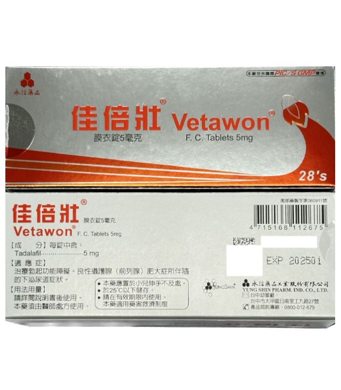 佳倍壯膜衣錠 20mg 為治療男性勃起功能障礙(Erectile Dysfunction, ED)的處方藥物。其主要成分為 他達拉非(Tadalafil),屬於第五型磷酸二酯酶抑制劑(PDE5 inhibitor)。口服後約 30 分鐘至 1 小時內起效,藥效可持續長達 36 小時,因此也被稱為「週末藥」,讓患者能更靈活掌握性生活時機。藥物機轉為選擇性擴張陰莖海綿體內的血管平滑肌,促進血液流入並維持勃起,但需有性刺激配合才能發揮作用。本品為 處方藥,需經醫師診斷後開立處方箋,方可合法購買與使用。