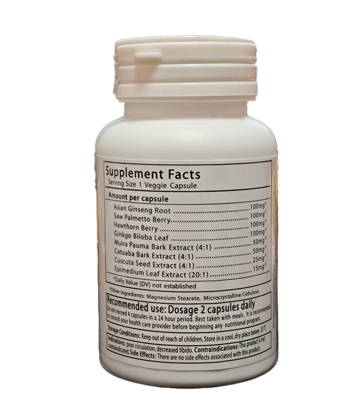 亞洲紅蔘、鋸棕櫚、淫羊藿、銀杏葉、山果、達米阿耶、枸杞、棍棍木、苑絲子等26種草本精華