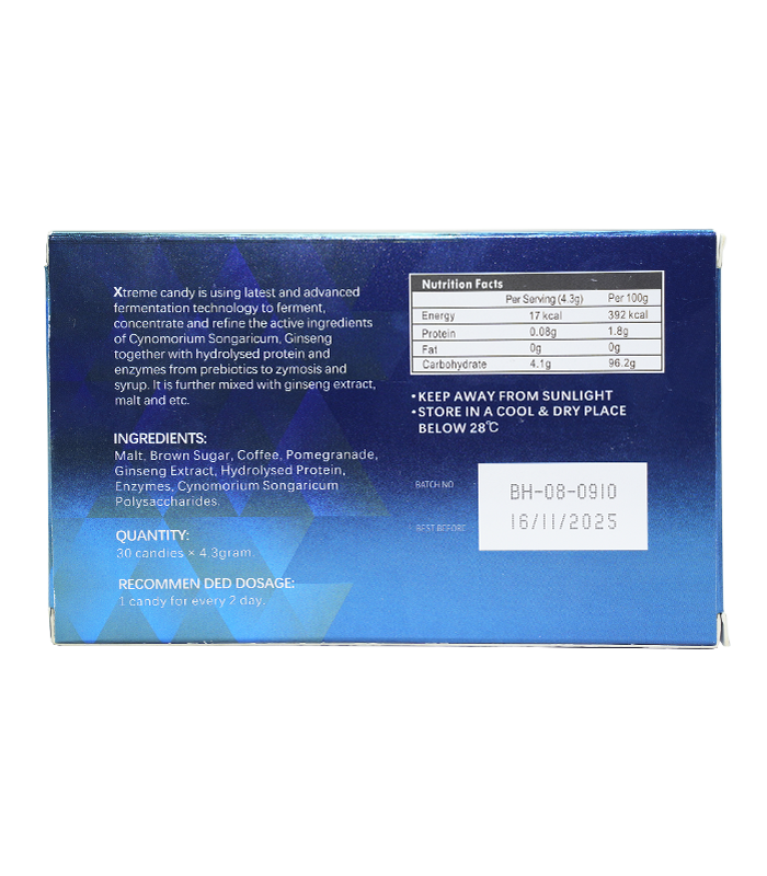 三代汗馬糖藍糖(Xtreme)歷經15年研發而成,是馬來西亞原裝進口的一款精力糖,在台灣也叫悍馬糖、hamer糖、汗馬精力糖。汗馬糖主要成分為鎖陽、人參,主要功效是補益陽氣,養筋健骨,補氣養血,緩解血虛型便秘,汗馬精力糖由於快速補充人體細胞營養,延緩老化進程非常有效,數年來已成為運動員首選的細胞營養產品。