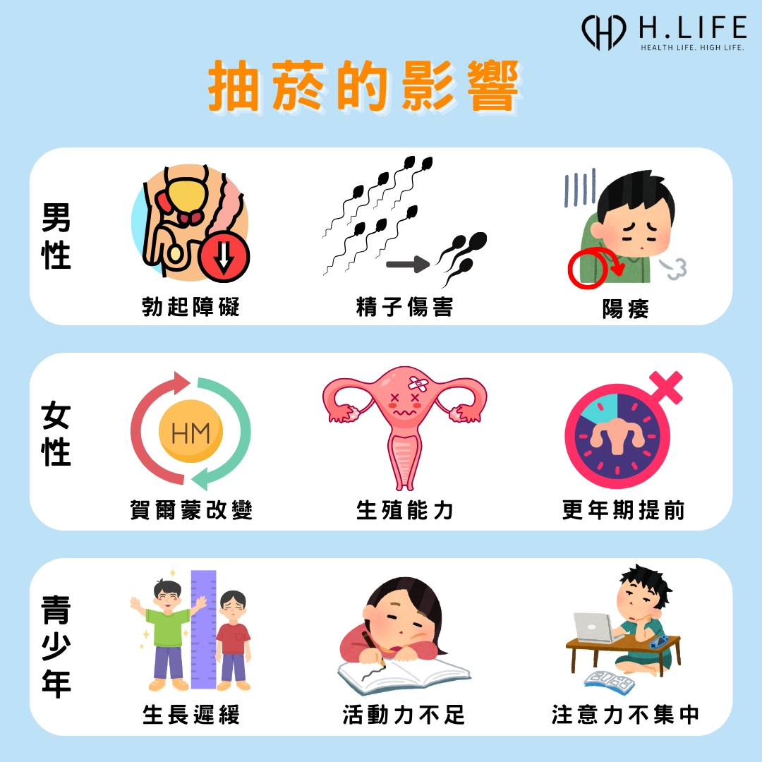 吸菸對生育能力的影響亦不容小覷,研究顯示吸菸男性的精子數量、活力和正常形態比例都明顯下降,這將對男性的生育能力造成負面影響。